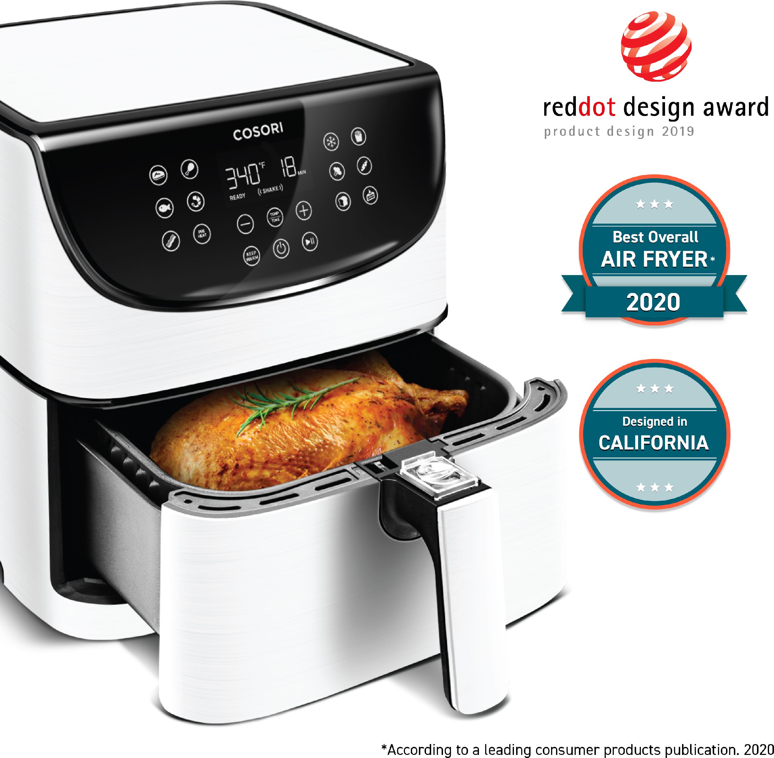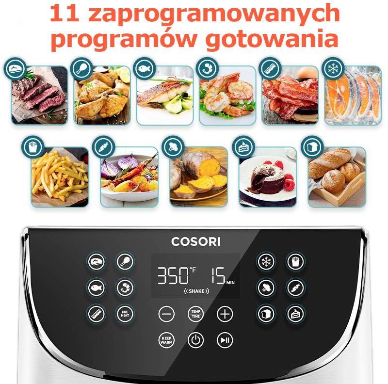 Cosori - це багатофункціональний прилад, який смажить, випікає, готує на грилі, розігріває їжу та розморожує. Завдяки функції SMART, ви можете керувати ним за допомогою програми VeSync або за допомогою голосових команд (Amazon Alexa, Google Assistant). У ньому можна приготувати більшість страв, від простих, таких як картопля фрі і тости, до різних м'ясних страв, риби, аж до піци або кексів. Вона може успішно замінити духовку і сковорідку. Завдяки місткому кошику можна приготувати їжу для 5 осіб.