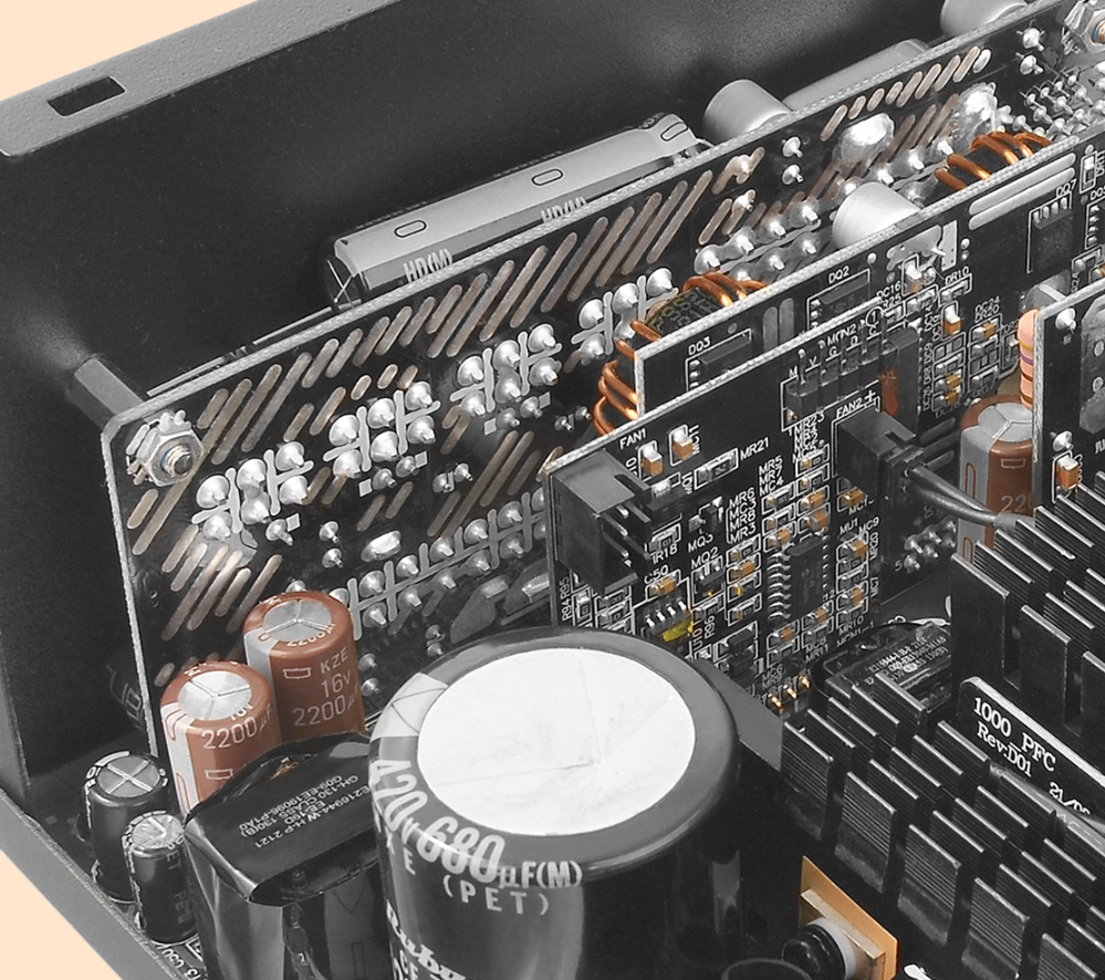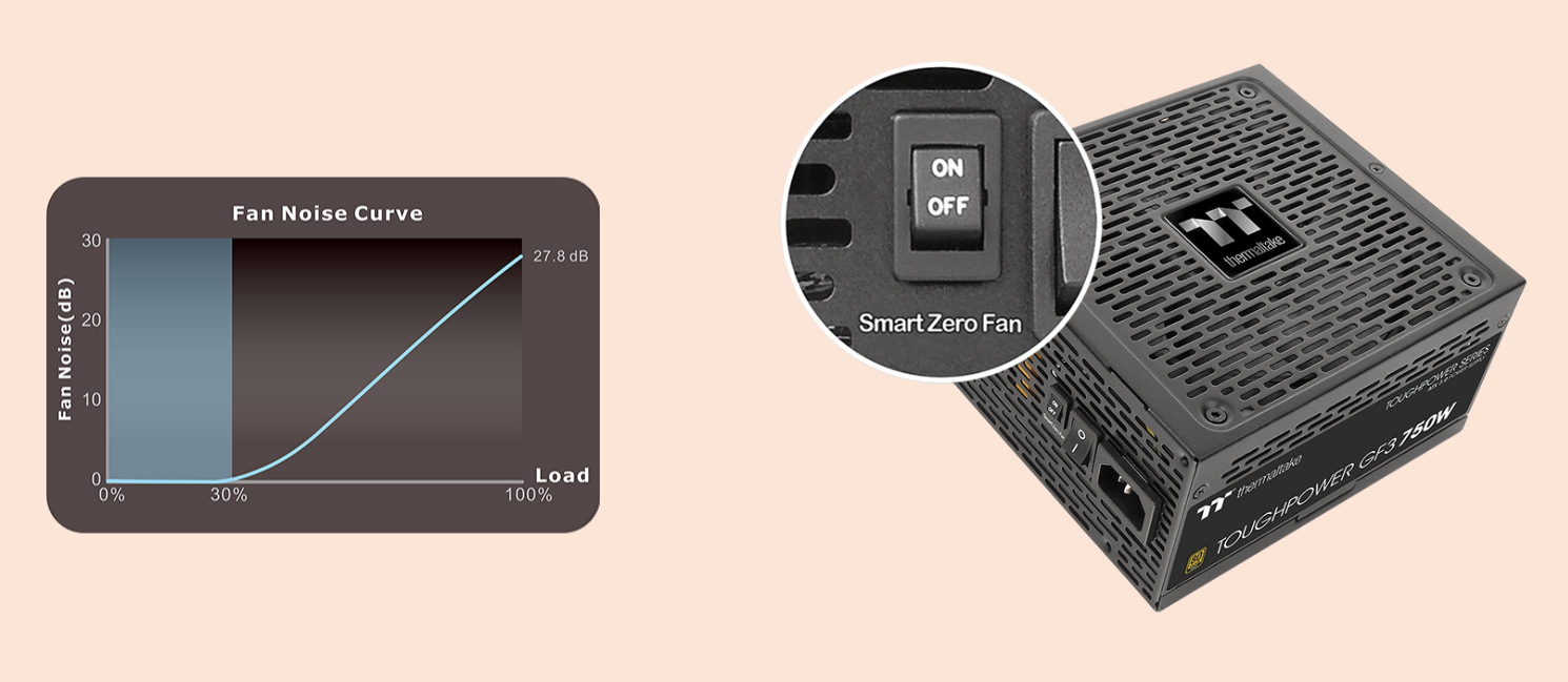 БЖ оснащено функцією Smart Zero, яка означає, що вентилятор не обертатиметься, доки навантаження не перевищить 30% від номінальної потужності БЖ. Це мінімізує шум вентилятора. Оснащений 135-мм вентилятором з рідинним охолодженням для чудової продуктивності охолодження.